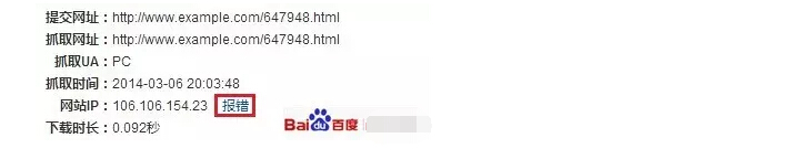 抓取診斷工具會檢查站點與百度的連接是否暢通,若站長發(fā)現(xiàn)IP信息還是老舊的,可以通過“報錯”通知百度搜索引擎更新IP,如下圖所示: